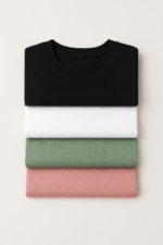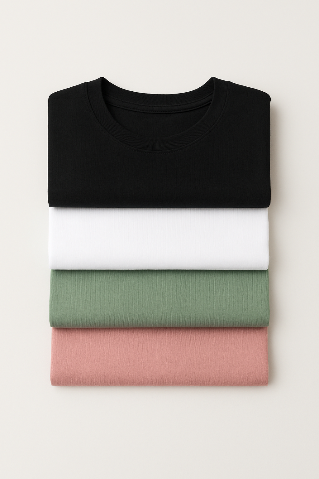 Pack of 4  Solid Tees – Sea Green, Pink, White & Black – Refresh your wardrobe with this versatile trio of classic tees. Made from 100% soft, breathable cotton, each tee offers an oversized, relaxed fit for all-day comfort. Perfect for casual outings, layering, or lounging, these timeless colors are wardrobe essentials that mix and match effortlessly.